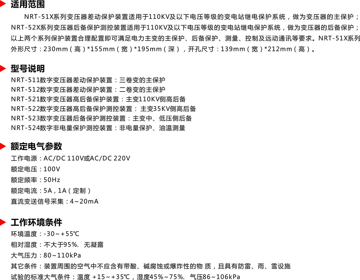 NRT-51X系列變壓器差動(dòng)保護(hù)裝置適用于110KV及以下電壓等級(jí)的變電站繼電保護(hù)系統(tǒng),做為變壓器的主保護(hù);